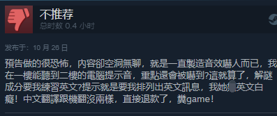 预告做的很恐怖,内容却空洞无聊,就是一直制造音效吓人而已,我在一楼能听到二楼的电脑提示音,重点还会被吓到? 这就算了,解谜成分要我练习英文? 提示就是要我排列出英文讯息,我她X英文白痴!中文翻译跟机翻没两样,直接退款了,粪game!