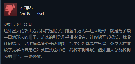 这外星人的攻击方式我真是服了。跨越千万光年过来地球,就是为了嗦一口地球人的niu子。游戏的引导几乎根本没有,让你找五卷锡纸,就没任何提示,地图搞得像个开放地图,结果处处都是空气墙,外星人在这放了光学结界是吧?反正就这样吧,我找不到锡纸,但外星人总能找到我的niu子。一坨答辩。
