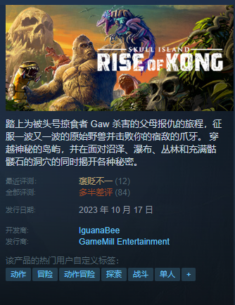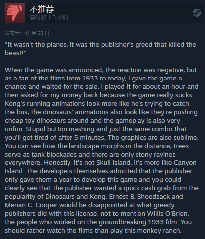 当游戏发布时,人们的反应是消极的,但作为1933年至今的电影粉丝,我给了游戏一个机会,等待发售。我玩了大约一个小时,然后要求退钱,因为这款游戏真的很烂。金刚的奔跑动画看起来更像是在赶公交车,恐龙的动画看起来也像是在推着便宜的玩具恐龙,游戏玩法也很无趣。愚蠢的按键敲击和相同的组合,你会在5分钟后感到厌倦。画面也很棒。你可以看到远处的风景是如何变化的,树木充当了坦克的路障,到处都是石头沟壑。老实说,那不是骷髅岛,更像是峡谷岛。开发者自己也承认发行商只给了他们一年的时间去开发这款游戏,你可以清楚地看到发行商想要从《恐龙》和《金刚》的流行中快速赚到钱。Ernest B. Shoedsack和Merian C. Cooper会对贪婪的出版商对这个授权的做法感到失望,更不用说制作这部 1933 年开创性电影的威利斯·奥布莱恩 (Willis O'Brien) 了。 你更应该看电影而不是去玩这个猴子牧场。