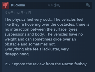 物理感觉非常奇怪......车辆感觉就像悬停在障碍物上,表面、轮胎、悬架和车身之间没有相互作用。这些车辆没有重量,有时可以滑过障碍物,有时则不能。
