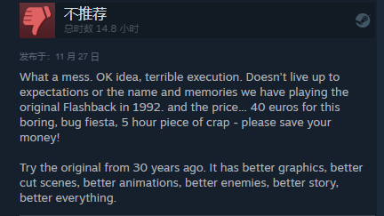 真是一团糟。想法不错,执行起来很糟糕。没有达到我们的期望,也没有达到我们在 1992 年玩原版《闪回》时的名字和记忆。而且价格……这个无聊的 bug 嘉年华需要 40 欧元,5 小时的垃圾 - 请省钱!
