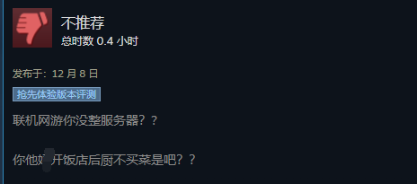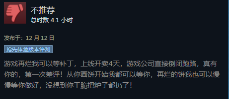 游戏再烂我可以等补丁,上线开卖4天,游戏公司直接倒闭跑路,真有你的,第一次差评!从你画饼开始我都可以等你,再烂的饼我也可以慢慢等你做好,没想到你干脆把炉子都扔了!