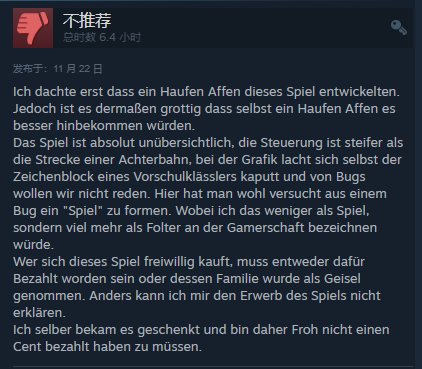 任何自愿购买该游戏的人都必须要么已付费,要么其家人已被劫为人质。我无法用其他方式解释购买游戏的原因。我自己收到了它作为礼物,很高兴我不需要支付一分钱。