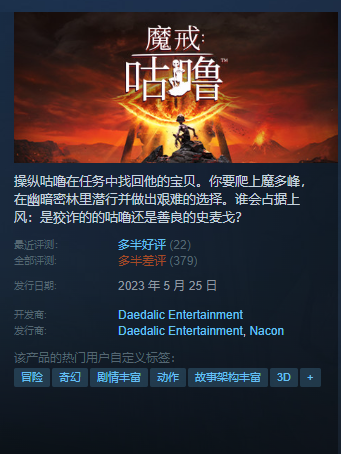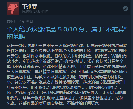 这是一部以咕噜为主角的第三人称冒险游戏,玩家在冒险的同时需要做许多选择,最终决定咕噜的哪个人格占据上风。这部作品的设定还算新颖,但制作水准极低。游戏的关卡设计很差,估计鉴于咕噜没有战斗力,所以游戏全篇都是潜行+爬墙+解谜,没有爽快感并且每个模式的设计都很差。游戏的剧情很无聊,十个章节就是讲述咕噜先从兽人基地越狱,再从精灵基地越狱。潜行时候玩家经常被地面各种小模型突起卡住,导致来不及逃走被发现;爬墙时候因为着力体积过小,经常对不准边缘或者走路掉落而摔死。游戏的细节贴图画质是十年前的水平,但4090显卡的帧数波动都巨大,时常感受到明显卡顿。游戏bug频出,好几处都完成解谜但不触发对话,让人以为哪里没做对,结果看视频发现up主直接过了,读档重来就也过了。总体来说,这部作品的质量确实堪忧,不推荐给任何玩家。