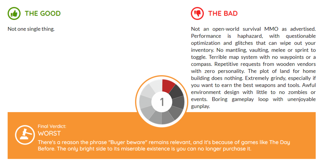 由于外媒GamingBolt是12月8日评选的TOP15,没想到都12月了《浩劫前夕》还能杀出来。不过后续评测给《浩劫前夕》打了1分,比TOP1《骷髅岛:金刚崛起》的2分还要低。所以《浩劫前夕》也荣登TOP 0,获得年度最差游戏。