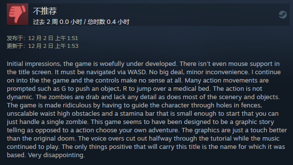 初步印象是,这款游戏的开发严重不足。 标题界面甚至不支持鼠标。 必须通过 WASD 进行导航。 没什么大不了的,小不便。 我继续玩游戏,但控制完全没有意义。 提示许多动作,例如G推动物体,R跳过医疗床。 动作不是动态的。丧尸很单调,缺乏任何细节,就像大多数风景和物体一样。这款游戏的荒谬之处在于,玩家必须引导角色穿过篱笆上的洞、不可伸缩的齐腰高障碍和一个小到只能对付一个僵尸的耐力条。这款游戏似乎被设计成一个图片故事,而不是一个行动选择你自己的冒险。画面比原版《毁灭战士》稍好一些。教程的配音在中途被剪掉了,而音乐还在继续播放。唯一值得肯定的是它的名字。非常令人失望。