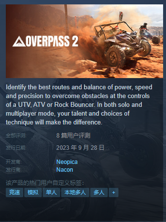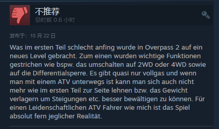 第一部游戏的缺点开始在《OVERPASS 2》中被提升到了一个新的水平。一方面,重要功能被删除,例如切换到2WD(两轮驱动)或4WD(四轮驱动)以及差速锁。它基本上只是全程踩油门,当驾驶ATV(全地形车)时,玩家不能再像第一部那样向一侧倾斜或转移重心,以更好地应对斜坡等。对于像我这样充满热情的 ATV 车手来说,游戏完全脱离了现实。