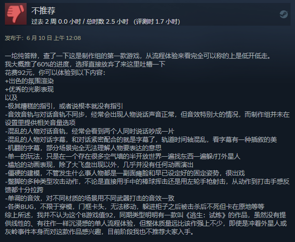 综上所述,我并不认为这个B游戏值92,同期类型明明有一款叫《逃生:试炼》的作品,虽然没有提供线性的、有往作一样沉浸感的单人流程体验,但整体质量远比该作强上不少,即使是冲着外星人或灰岭事件本身而对这款作品感兴趣,目前阶段我也不推荐大家入手。