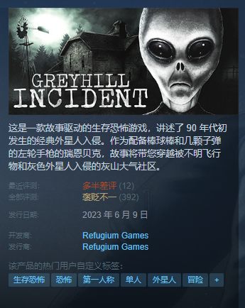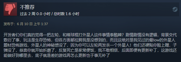 开发者们你们真的觉得一把左轮,和棒球棍打外星人这件事情泰酷辣?剧情剧情没有逻辑,背景交代敷衍了事,玩法是生存恐怖,但各方面都拉胯我是没想到的,而且这绝对是我见过的最low的外星人题材恐怖游戏,外星人的神秘感没了,因为你可以左轮两发杀一个外星人!他们还硬贴你脸上蹭,子弹没了,恭喜你就开始折磨了,反复死亡是家常便饭,我不敢相信,后面即便有更新补丁,这游戏还能做好到哪里去,底子就是差的游戏再怎么更新也于事无补了