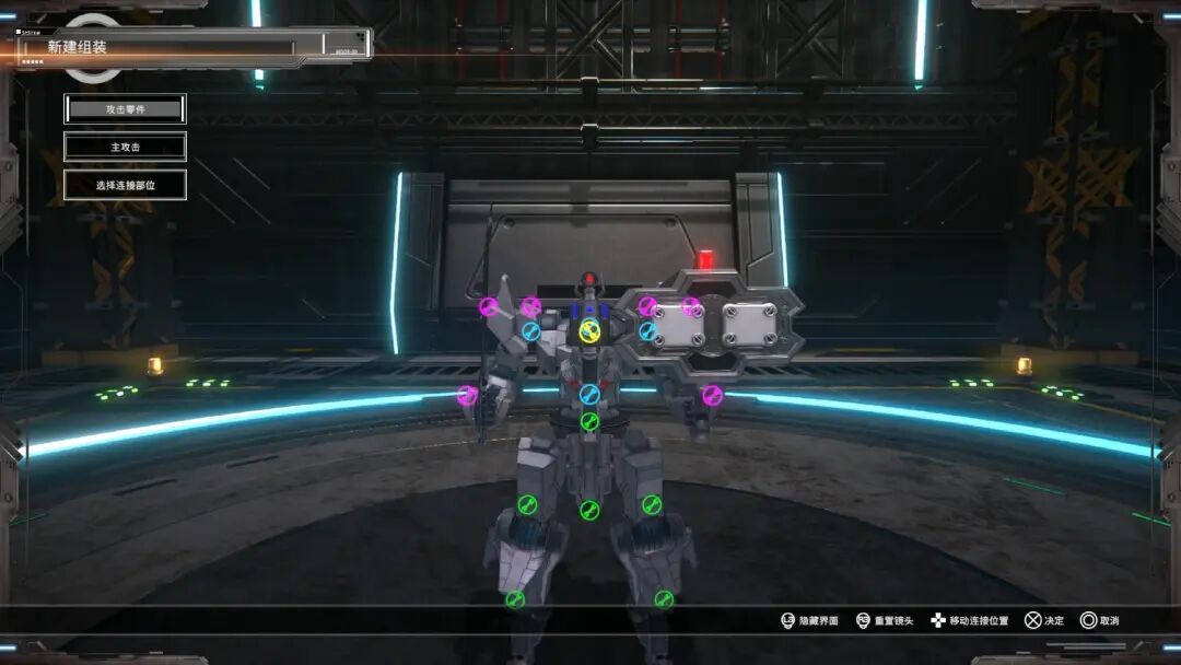 接下来是装备攻击零件和装饰品,主武器的装配除了躯体原有的连接点,头部追加一个连接点,每个手臂各追加三个连接点。并且每个连接点都可以反复使用,投掷武器、近战武器、自动武装和必杀的装配也基于这些连接点。