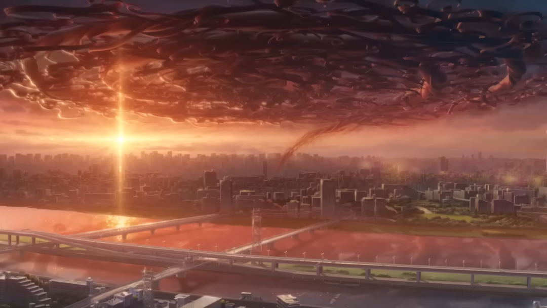 作为所谓“天灾三部曲”的最后一部作品,新海诚这一次用到的灾难是“地震”。在《铃芽之旅》的世界观中,日本的地震是由一种存在于“常世”(与现世对应,即“死后的世界”)的、名为“蚓厄”的神话存在引发的。