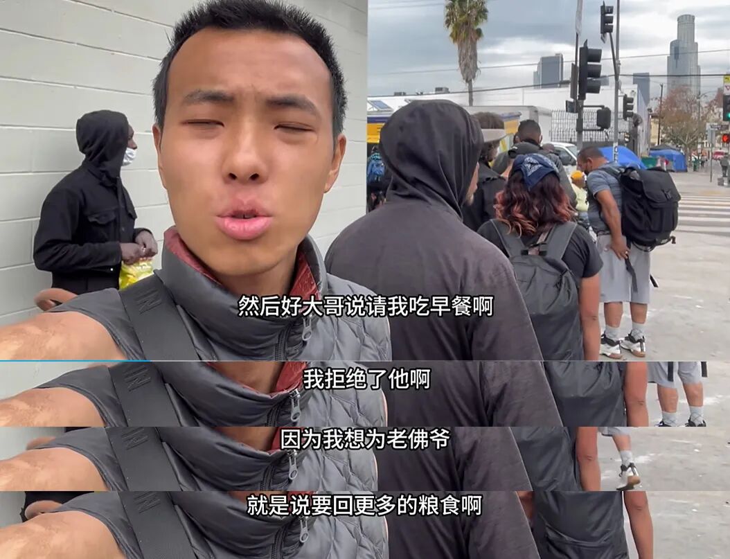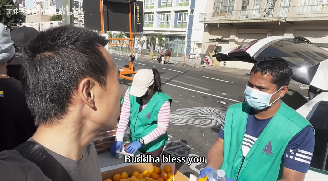 如果食物发放点的义工是女性,讲师还会额外补上一句“You are very very gorgeous!”。或者碰上了信仰不同的义工,讲师同样会适时调整自己输出的吉祥话。