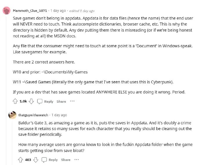 有玩家指出,照理说“Appdata”并不应该用来存放游戏存档,这个文件夹本来是为了专门存储用户永远不需要手动管理的文件,如果某个游戏开发者把存档路径设置到了这里,那说明他们没理解清楚。事实上Windows系统是专门设置了存放游戏存档文件的路径的,那就是“保存的游戏”文件夹,然而好多开发者却并不使用它,甚至连一些微软第一方游戏也不用。不知道大家对于PC游戏存档位置的凌乱特性有何感想呢?