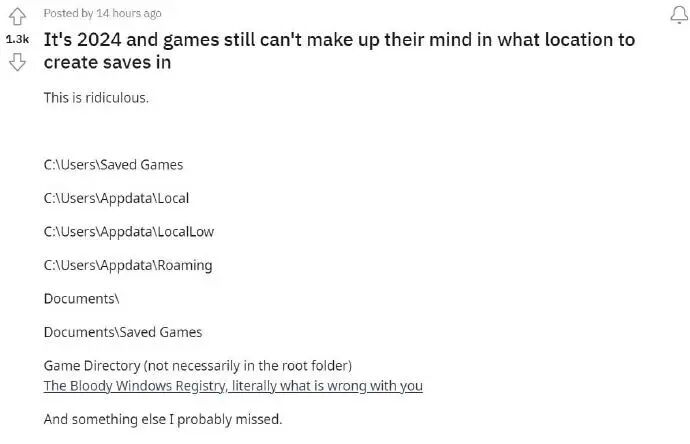 如果你鼓捣过PC游戏存档文件,那么你可能知道很多PC游戏会把存档放在不同的位置,并没有一个统一的存档路径。这给不少玩家带来了一些困扰,每次还得专门上网查一下每款游戏的存档位置。最近就有玩家狠狠吐槽了这件事:都2024年了,PC游戏竟然还是没有一个统一的存档位置!