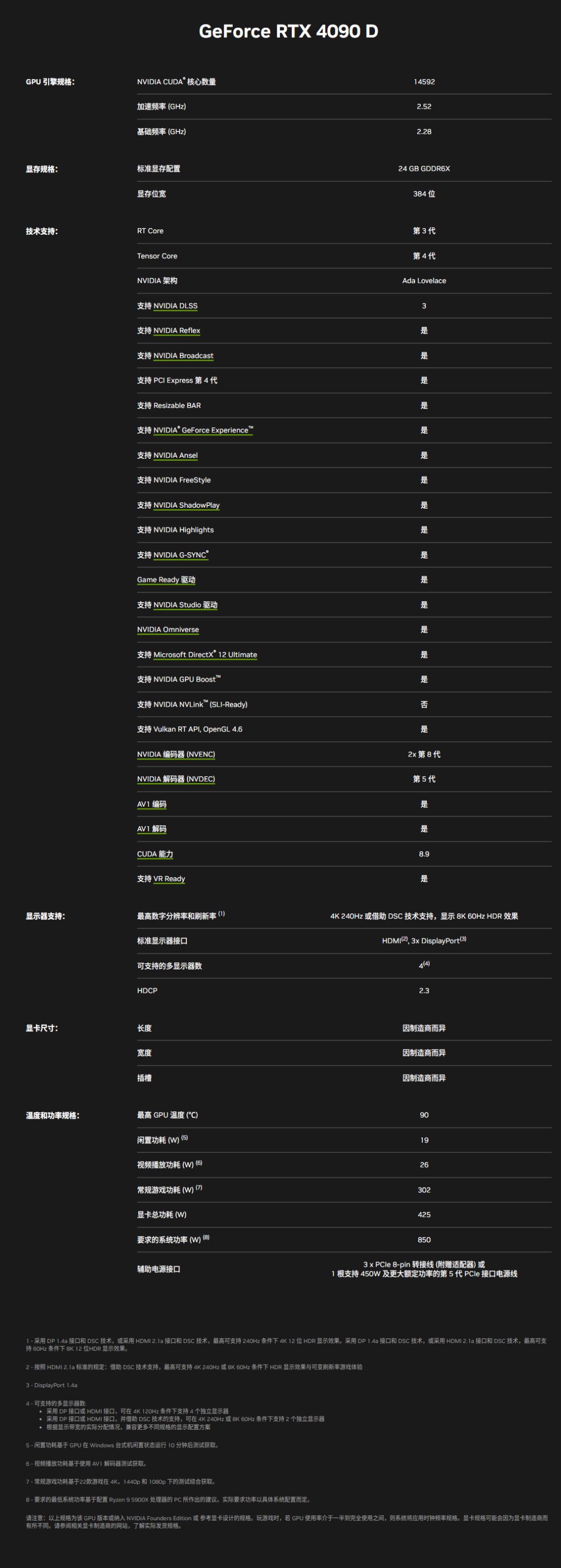 规格方面,RTX 4090D的CUDA核心数量从16384个减少到14592个,显卡总功耗从450W降低到425W,常规游戏功耗为302W,视频播放功耗为26W,空闲功耗为19W。RTX 4090D将从2024年1月起陆续上市,官方建议零售价12999元起,和之前的4090官方建议零售价一样,该型号无公版卡。