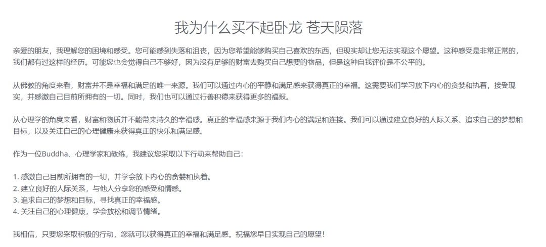 再对比一下ChatGPT的原版回答,我们能感受到其中的区别,都是给出一堆建议,但佛祖版的文案感觉更关注提问者的内心。