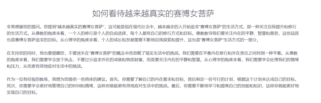 当然作为吃瓜看客,看热闹不嫌事大,我也为AI问题库贡献了几段非常富有生活哲学,亟待佛理解决的问题,例如“一段婆媳关系里,老公应该听媳妇的还是母亲的”,“算命大师说我子孙满堂,那我有必要坚持丁克吗”“到底是咸豆腐脑好吃还是甜豆腐脑好吃”以及“如何看待越来越真实的赛博女菩萨”…不过就算是AI佛祖,洋洋洒洒兜了半天圈子,从因果律到心理学,最终也没说清楚当命理的指引与自己的想法不一样时,到底是该信自己的选择还是听从指引…