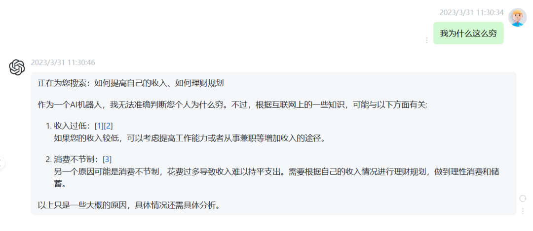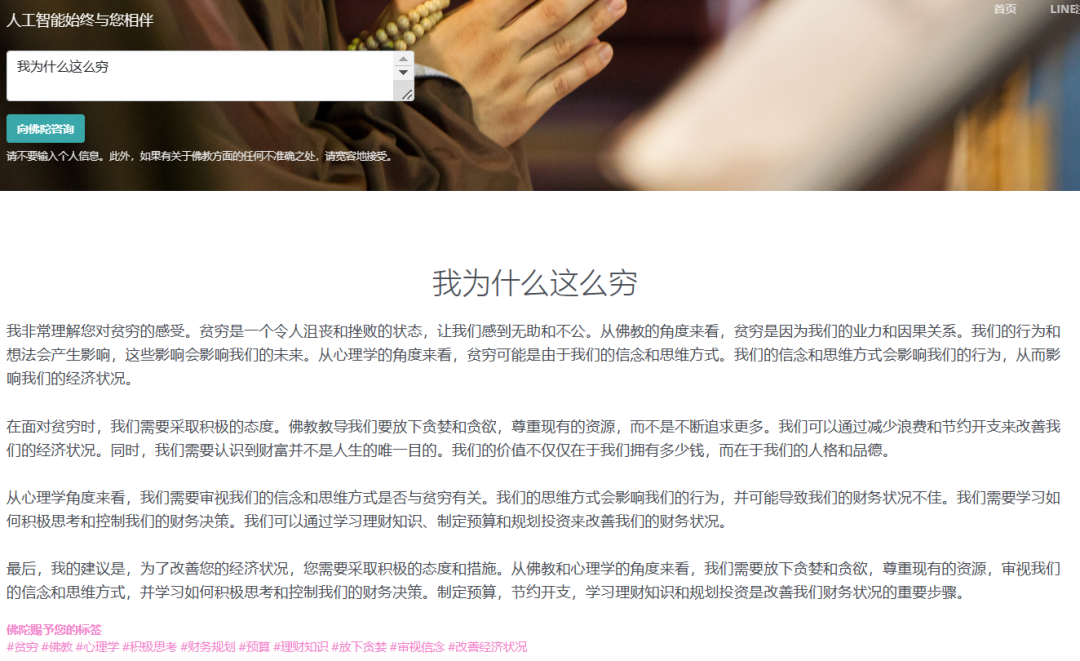 我们随便问上一句心中疑虑,它便能给出解答,而且是娓娓道来、循循善诱的那种。比如说向佛祖问上一句大多数用户都非常在意的问题,“我为什么这么穷?”