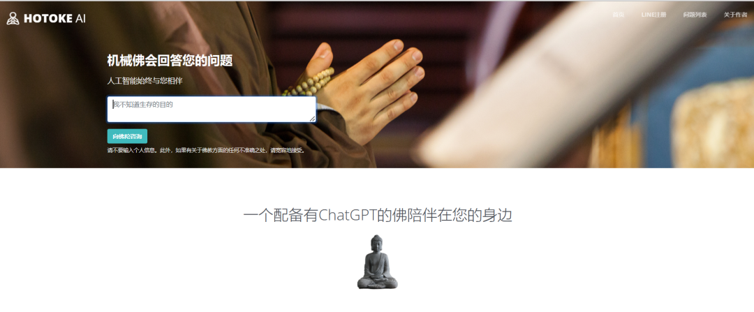 而在前不久,日本一个名为HOTOKE AI的网站迅速走红,原因也是因为是运用了ChatGPT创造出AI佛祖,搞了一出赛博玄学。