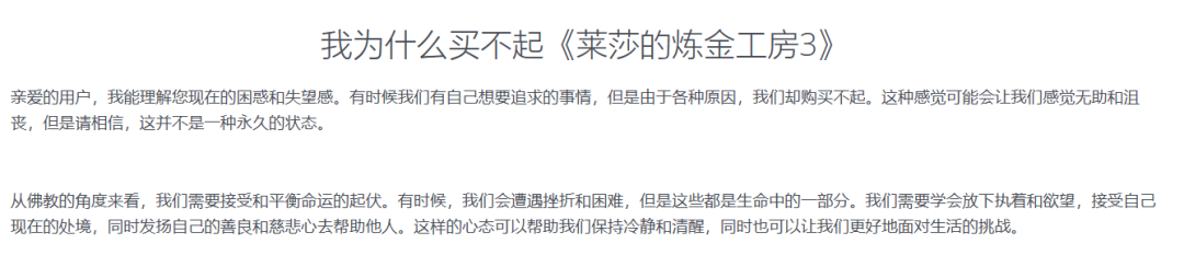 不过作为一个游戏编辑,我还是找了更加专业的角度来向佛陀提问,比如在一次提问里把” 我为什么这么穷?“替换成了”我为什么买不起《莱莎的炼金工房3》?“