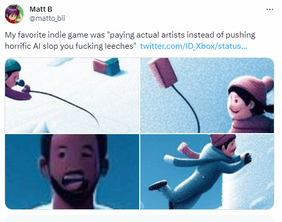 而美术师“NecroKuma”也吐槽了这件事,他认为微软Xbox使用AI图片,说明他们并不关心独立开发者。如果微软Xbox都不愿意花钱雇佣真人来做宣传,他很怀疑微软Xbox部门会愿意雇佣独立开发者做游戏。Xbox独立游戏目前已将该推文删除了。