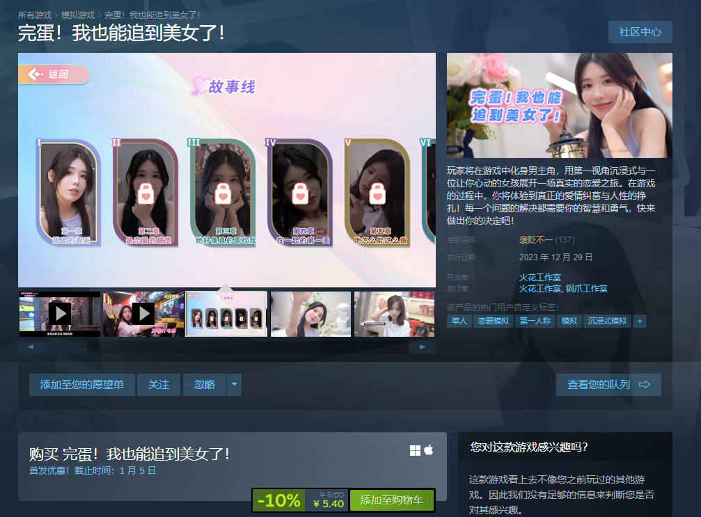 随着《完蛋!我被美女包围了!》在steam上的爆火,一批紧跟热度的国产真人模拟恋爱互动影视游戏纷纷亮相,一款由火花工作室制作的国产真人模拟恋爱互动影视游戏《完蛋!我也能追到美女了!》已于昨日发售,售价6元,首周折扣-10%售价5.4元,不过目前该作好评率仅49%.