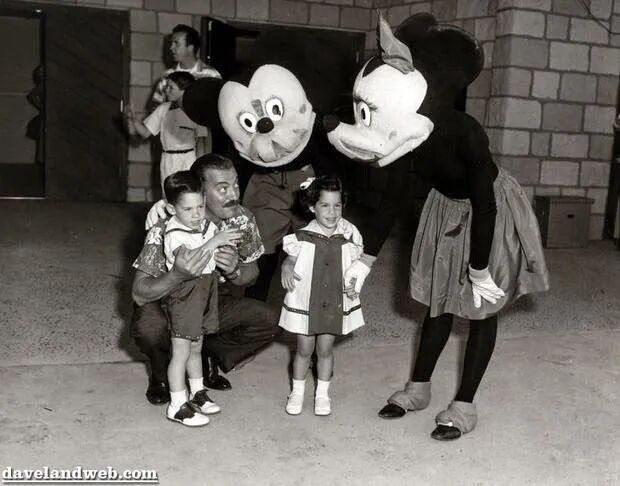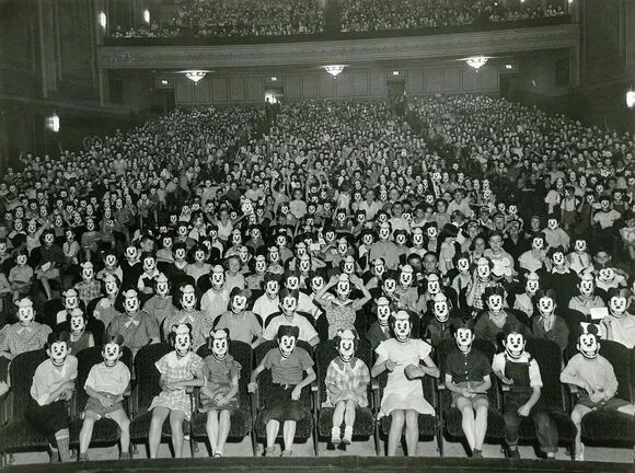 除了并不那么适合儿童的动画,米老鼠本身黑白的配色,在黑白照片的映衬下也显得分外诡异。