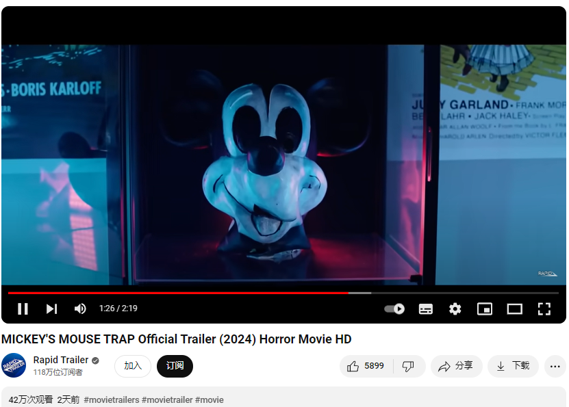 差不多在同一天,一部恐怖电影《米老鼠的捕鼠夹》也在油管上发布了一段预告片,并且计划3月份在北美上映。