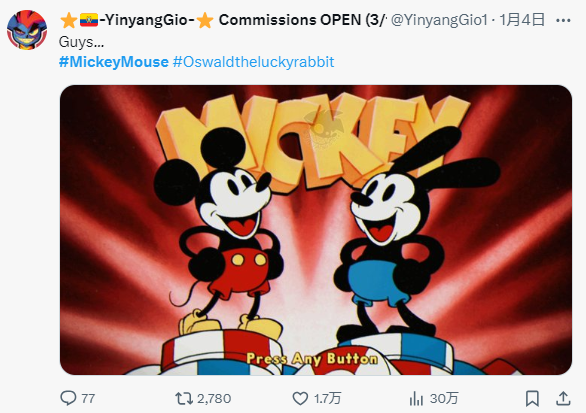 不过毕竟距离初代米老鼠解除版权还没有一周,这场“狂欢”还远未结束。所以,大伙们也可以期待一下更多“有意思”的二创了。