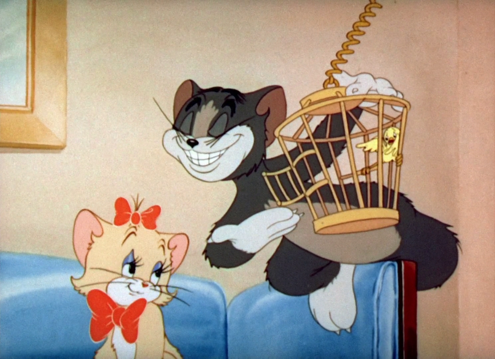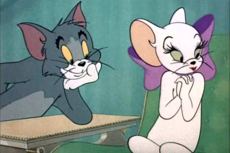 比如早在汤姆和杰瑞的经典原画皮肤还没被确定的1942年,上映的第6部短片《猫儿心上人》中已经出现了一只名为图丝的黄色小猫,她算是那一场猫鼠追逐游戏的“导火索”。想尽一切办法获得小母猫的芳心的汤姆却遭到了杰瑞的百般阻挠,最终大胆的杰瑞还夺下了纯情小母猫图丝的初吻。