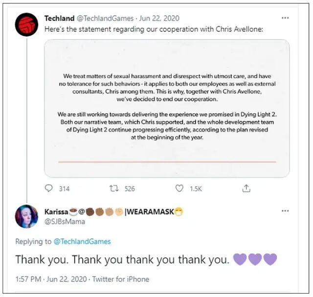 3月25日,三年前由于被指控性侵失去大部分工作的知名游戏编剧克里斯·阿瓦隆在推特转发了指控者Karissa Barrows和Kelly Rae Bristol的致歉声明。