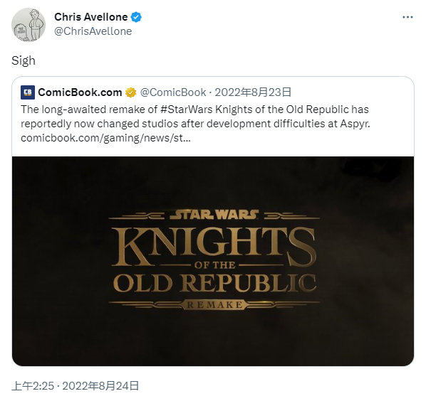 在他的推特,你可以看到大量与游戏相关的讨论。网友们乐于和他讨论《星球大战》和《辐射》系列的种种设定,他还经常贬低自己创造的角色达斯·奈亚利斯,认为其战力不如这不如那;而在《旧帝国武士》重制版延期的消息放出时,他连发三条推文对此表示遗憾。
