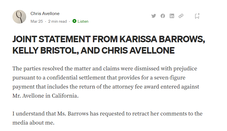 在被指控一年之后的2021年6月,他发布了一篇名为《It's Come To This》的长文,详细阐述了自己与Karissa从相识到不欢而散的全过程。在克里斯·阿瓦隆的陈述中,他用另一个角度说明了2012年那个晚上发生事情的始末,并指出Karissa此举很可能是对自己与其“好友”Jackie(也正是克里斯·阿瓦隆道歉的对象)的一段失败感情的报复。