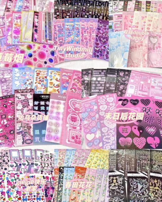 不仅仅咕的贴纸风格各异,丝带、蝴蝶结、光晕、花草系、爱心、链条、字母等等,堪称“美图秀秀实体版”。