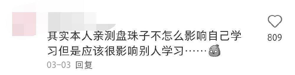 同时,因为不少同学下课盘手串,上课仍在盘,而手串发出的“咯哒咯哒”的声音也让不少认真上课的同学感到烦躁。