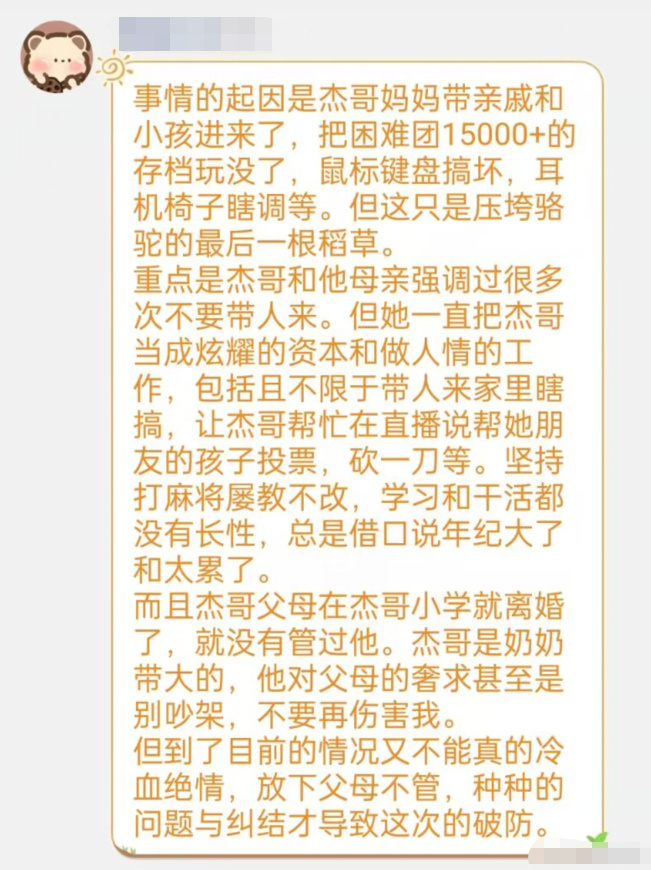 然而,就是这么一个世界排名前30,15000多管困难团的存档,却被亲戚家的一个熊孩子给清零了,而杰哥直播间的不少设备也遭到了破坏,损失严重。