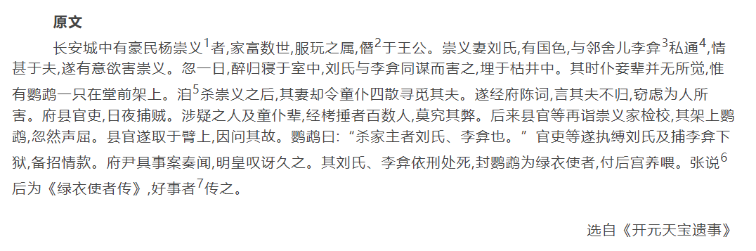 长安府尹将事情的前后经过,上奏给时任一国之君的唐明皇李隆基,李隆基听说后,“叹讶久之”,加封那只鹦鹉为“绿衣使者”,交付后宫喂养,以酬劳它替主人申冤报仇的功劳。