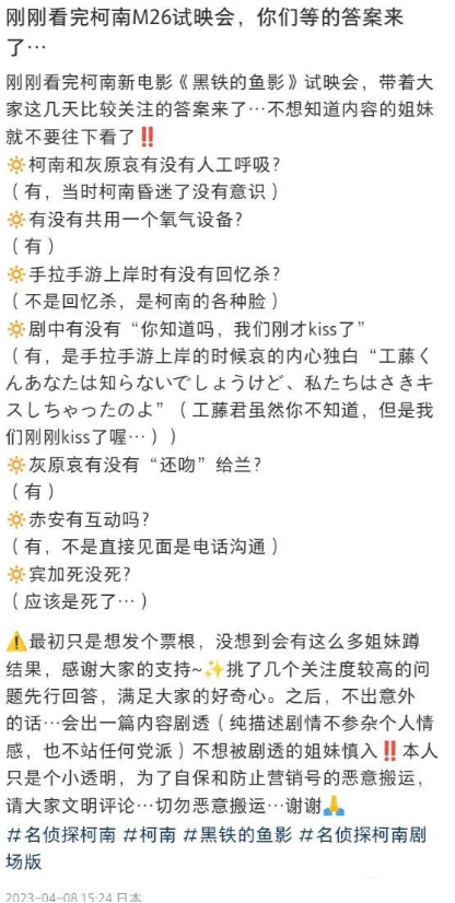 在这张由于当事人删帖导致无法追溯其真实性的截图中,介绍了黑铁的鱼影中观众们最为关心的一段剧情——在灰原哀沉入大海后,柯南是怎么把她救上来的。