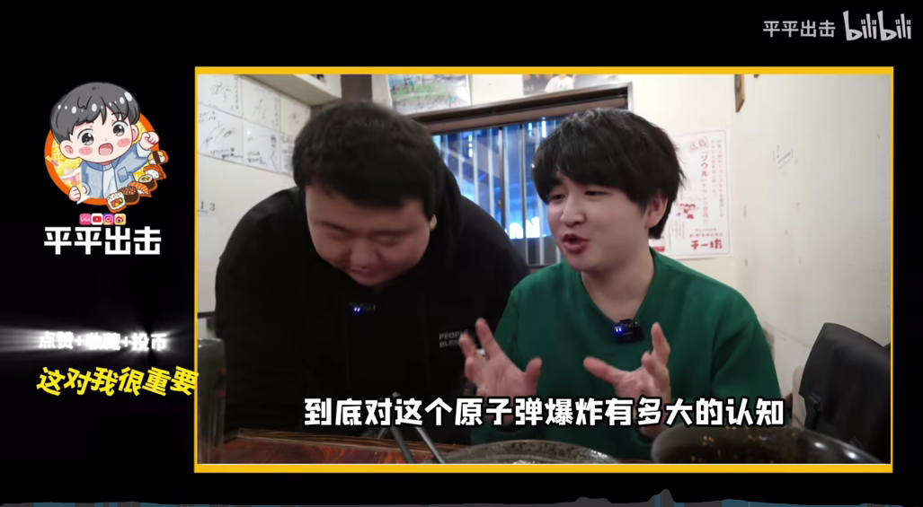 在正片的吃播环节结束之后,在视频不到两分钟的花絮里聊到了这些“禁忌”话题。聊到这个是因为看他们视频的很多粉丝都有着旺盛的好奇心,经常私信他们想知道日本同学对原子弹爆炸认知有多少…
