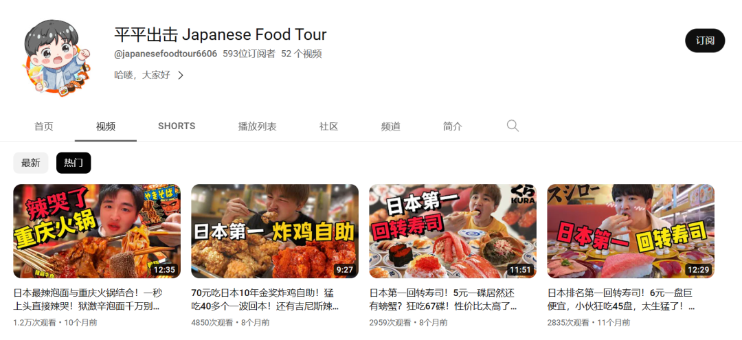 整个频道的画风其实就是普通的美食博主调调,发布的大多数视频内容都是品味日本当地美食为主,带着粉丝去体验一下日本广岛居民的正常生活和特色食物,用新鲜诱人的吃播填饱观众肚子里的馋虫。