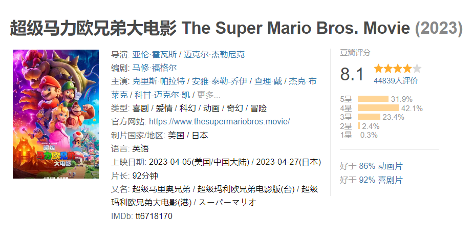 当然,说到这儿大伙应该也能理解《超级马力欧兄弟大电影》尽管评分不低,但评价却呈现两极分化的原因了。