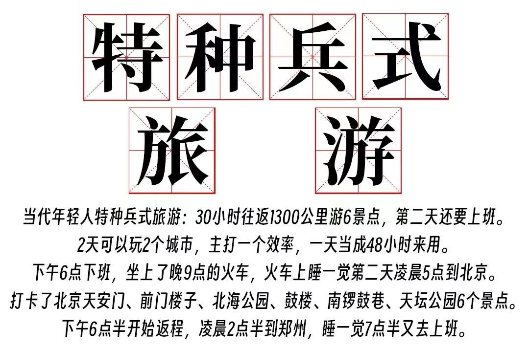 而最近,即便是不常上网,我想你可能也在哪个地方听到过这个看起来没有任何相关性,但又被紧紧绑定在一起的新名词——“特种兵式旅游”。