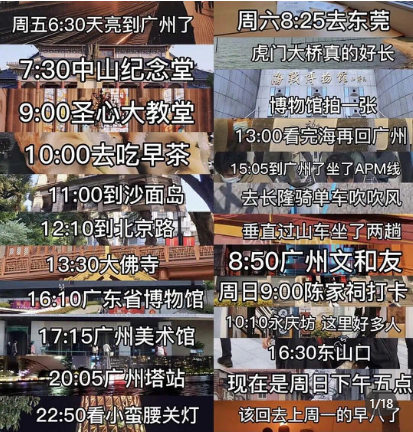 “周五6:30到广州,7:30打卡中山纪念堂,9:00圣心大教堂,10:00去吃早茶……玩到周日的下午五点,是时候回去上周一的早八了。”