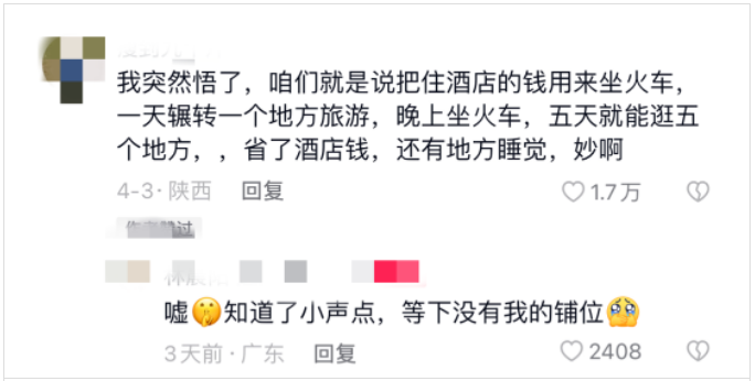 “把住酒店的钱用来坐火车,白天逛不同的城市,晚上在火车上睡觉,既有地方睡,还能去不同的地方旅游。”