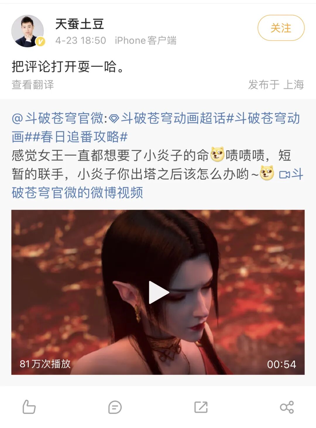 就连《斗破苍穹》作者天蚕土豆也看热闹不怕事大,在微博上调侃动画官方“把评论打开耍一哈”。