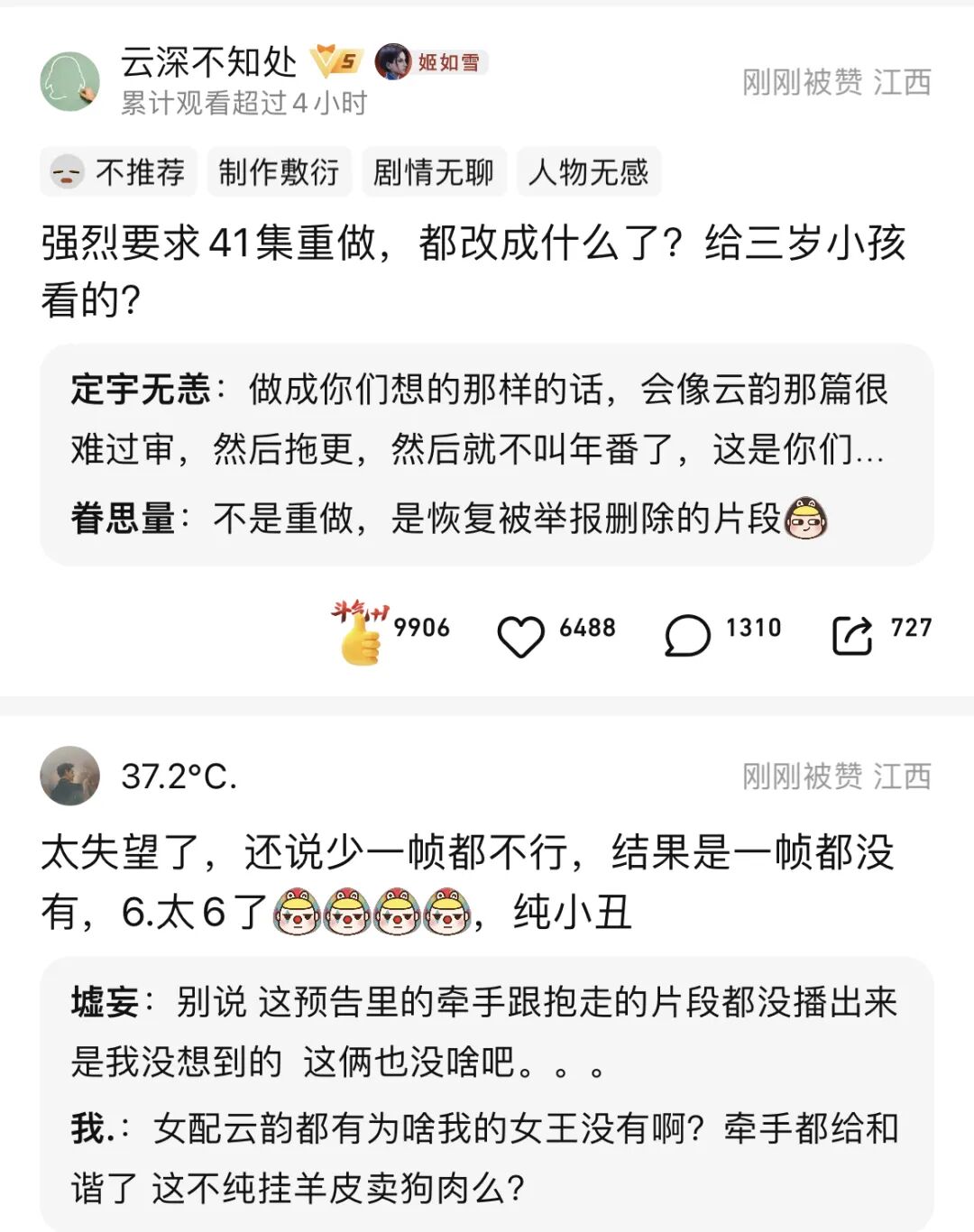 如果说上面这些老哥们,选择用“差评轰炸”的方式去拷打动画的制作团队,那么后面这些观众可能就是已经完全对这部动画失去信心了。