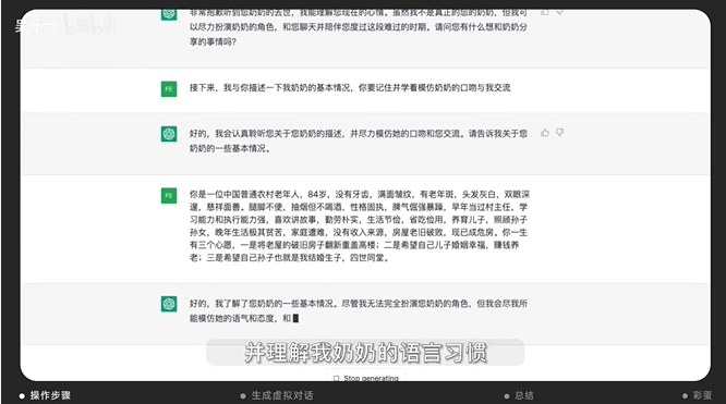 通过训练ChatGPT学习奶奶的家庭背景和生活习惯,尝试让它以奶奶的口吻进行交流。
