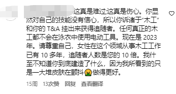 她表示,po出这些穿比基尼做木工活的视频,不仅仅只是展露身体,而更多的还是记录自己的生活,以及思考用怎么样的方式推广自己的木工艺品。