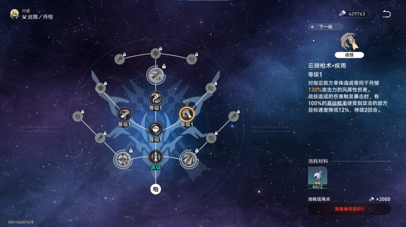 行迹就是角色的技能养成树,这部分也比较简单。当主角突破到一定程度便能升级技能,左侧的素材为需要花费体力刷取的技能,而右侧的则需要玩家自行找怪物刷取。