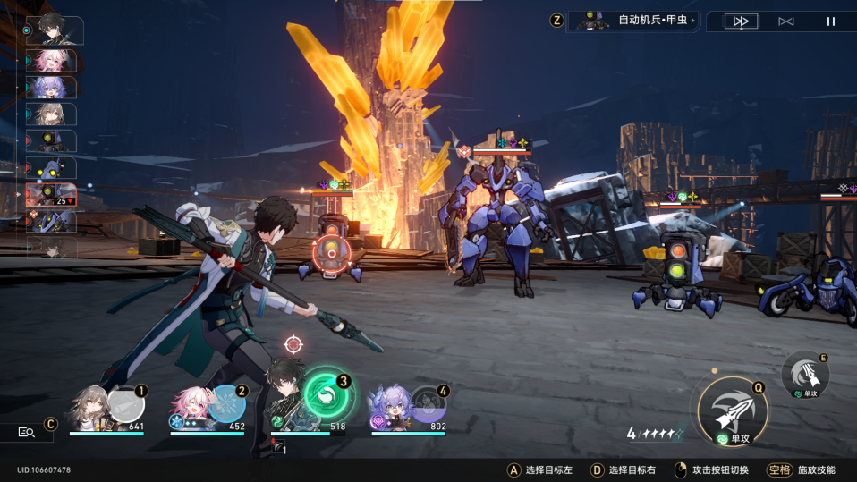 游戏的战斗是经典的回合制玩法,角色们的行动顺序依靠速度属性决定。与大部分回合制的游戏相似,左上为人物的行动进度条,左下为角色界面右上倍速之类的对局调整;总的来说就是比较经典的回合制战斗的模式。